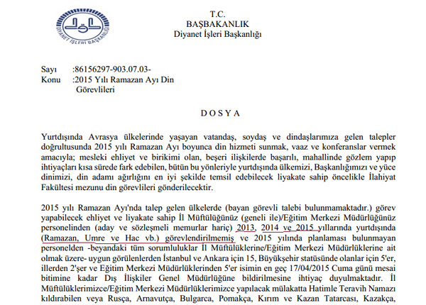 Örneğin Ramazan Ayında Hatimle Teravih Namazı kıldırabilecek görevli için, 2013-2014-2015 yıllarında Ramazan-Umre-Hac görevlendirilmesi olmayan görevlilerin müracaat edebileceği belirtilmiş.